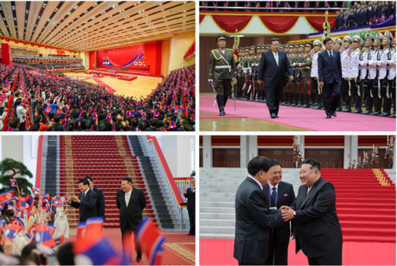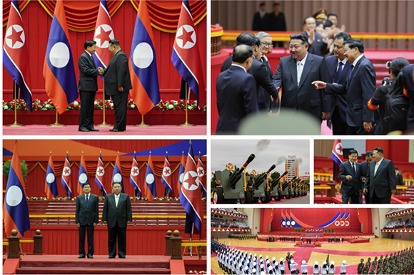 김정은동지께서는 라오스인민혁명당 중앙위원회 정치국 위원이며 정부부수상 겸 안전보위상인 위라이 라캄홍동지, 라오스인민민주주의공화국 외무상 통싸완 폼비한동지를 비롯한 라오스측 수행간부들과 인사를 나누시고 통룬 씨쑤릿동지와 함께 사열대에 오르시였다.