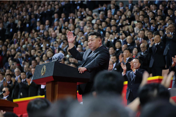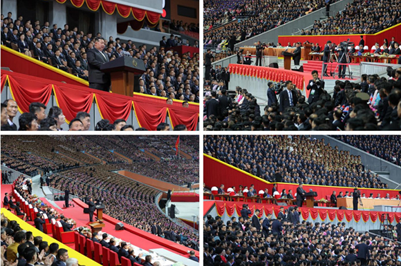 김정은동지께서 연설을 마치시자 향도의 우리 당을 따라 전면적국가부흥의 활로를 힘차게 열어나가며 사회주의 우리 조국을 이 세상 가장 강대하고 존엄높은 나라로 그 위용 만방에 떨쳐갈 인민의 드팀없는 신념과 의지가 폭풍같은 《만세!》의 환호성으로 터져올랐다.
