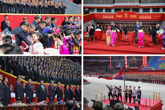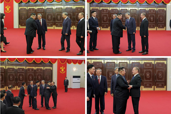 조선로동당창건 80돐 경축행사에 참가하기 위하여 우리 나라를 방문하고있는 여러 나라 당 및 정부수반들과 인사들, 대표단, 해외동포축하단 단장들에게 어린이들이 꽃다발을 드리였다.