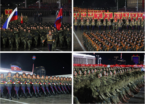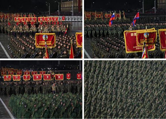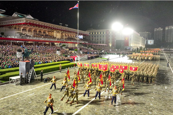 위대한 당중앙의 사상과 령도에 절대충성, 절대복종하는 결사옹위의 전위대오, 천하제일강군의 기상이 열병대원들의 름름한 모습과 틀어잡은 무장마다에 용솟음쳤다.