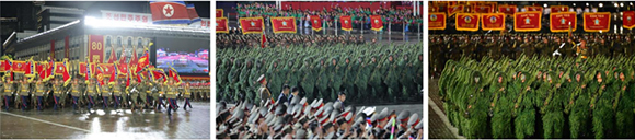 우리 당이 굳건하고 우리 국가가 강대한것은 무적의 정규군과 함께 위력한 민간무력을 가진데 있음을 과시하며 로농적위군종대와 소년근위대종대가 활기찬 보무로 도보종대의 마감을 장식하였다.