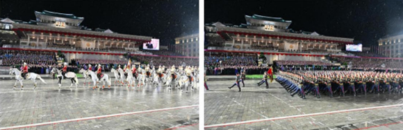 군악대원들의 변화무쌍한 률동대형과 녀성군도수들의 특색있는 군도기교동작에 이어 소고수들과 명예위병들이 능란하고 재치있는 소고 및 무기기교를 펼쳐보이였다.
