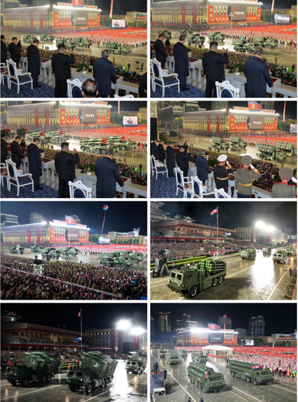 세계가 무시할수 없는 우리 국가의 무진무궁한 국방기술적잠재력과 경이적인 발전속도를 과시하며 장거리전략순항미싸일종대, 무인기발사차종대, 지상대공중, 지상대지상미싸일종대들이 련이어 진군화폭을 펼치였다.