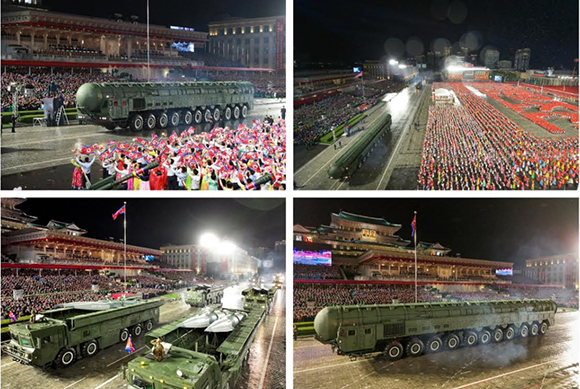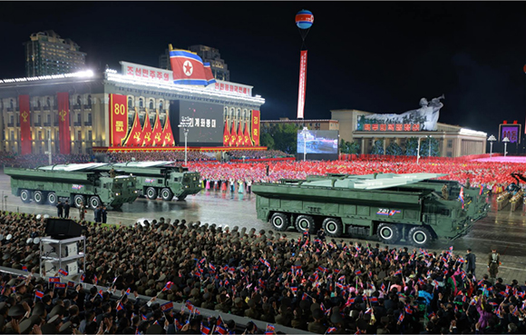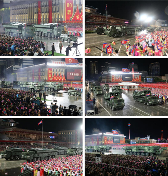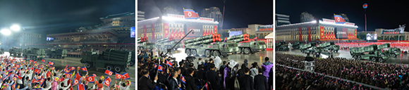 한치도 양보할수 없는 생존권과 발전권, 평화수호를 위하여 우리 당이 끊임없이 증대시켜온 자위국방력의 정수를 이루는 절대적힘의 실체인 전략무기체계들이 지심을 울리며 광장에 진입하였다.