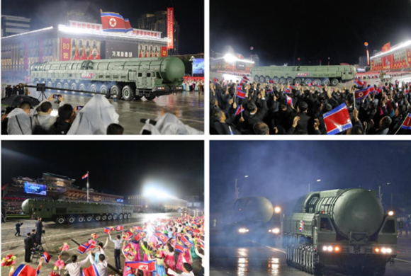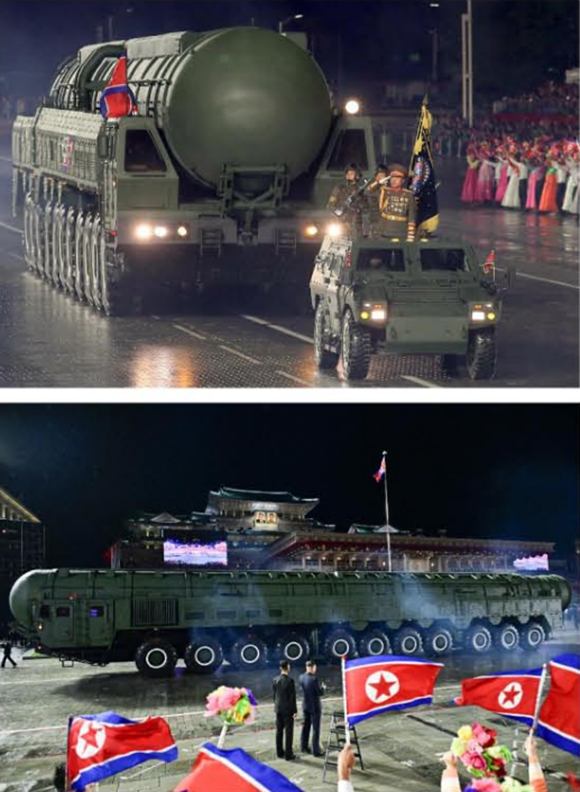 조선민주주의인민공화국의 최강의 핵전략무기체계인 대륙간탄도미싸일 《화성포-20》형종대가 주로를 메우며 광장에 들어서자 관중들이 터치는 열광의 환호는 고조를 이루었다.