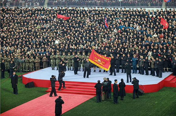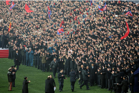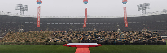 김정은동지께서 주석단에 나오시자 꿈결에도 뵙고싶던 아버지원수님을 영광의 단상에 높이 모시고 뜻깊은 창립일을 기념하는 최대의 행복을 받아안은 전체 참가자들이 터치는 폭풍같은 《만세!》의 환호성이 천지를 진감하였다.