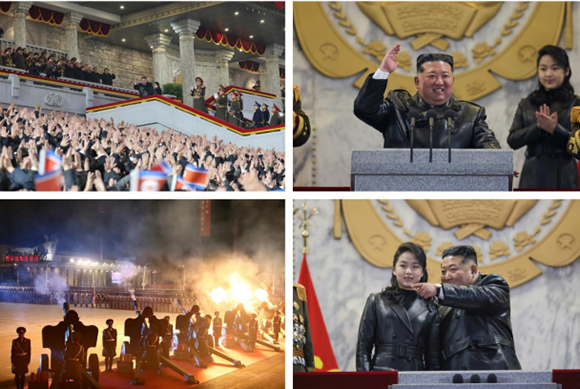 조선로동당 총비서이시며 조선민주주의인민공화국 국무위원장이신 김정은동지께서 열병광장에 도착하시자 폭풍같은 《만세!》의 환호성이 하늘땅을 진감하고 축포가 터져올라 수도의 밤하늘에 황홀한 불꽃바다를 펼치였다.
