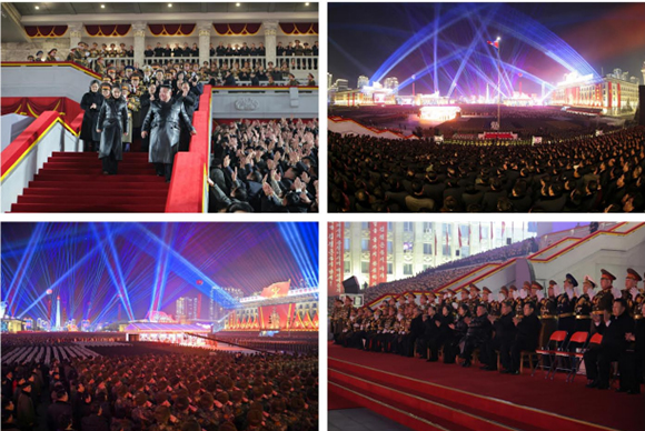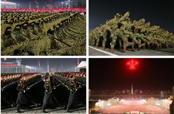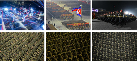 주체혁명의 탁월한 령도자이시며 모든 승리와 영광의 상징이신 김정은동지를 조선로동당 총비서로 변함없이 높이 모신 크나큰 감격과 환희를 안고 사회주의위업수행의 진일보를 목표한 새 단계 변혁투쟁을 최정예강군의 힘찬 보무로 개시하게 될 열병광장은 불야경으로 빛나고있었다.