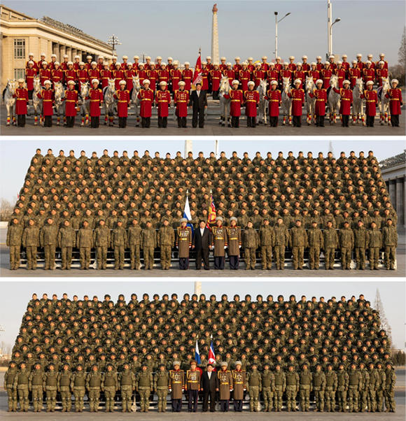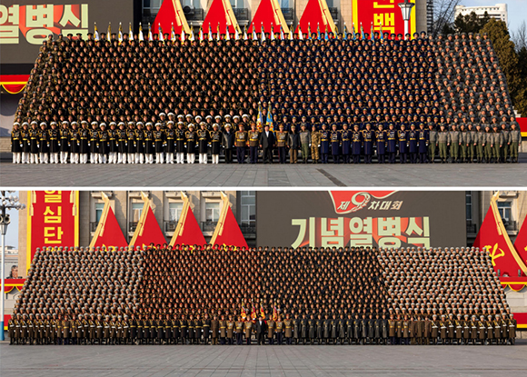 조선로동당 총비서이시며 조선민주주의인민공화국 국무위원장이신 경애하는 김정은동지께서 2월 27일 당 제9차대회기념 열병식에 참가하여 기세찬 보무로써 우리당 투쟁강령에 대한 공화국무력과 온 나라 전체 인민의 절대적지지와 필승의 자신심을 힘있게 과시한 조선인민군 각급 부대, 단위의 지휘관, 병사들을 만나시고 기념사진을 찍으시였다.
