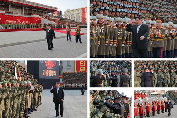 김정은동지께서는 승리의 열병광장에서 지축을 울리며 용감히 출발한 조선인민군의 새로운 행군길에 자랑찬 위훈과 명성만이 충만되리라는 기대와 확신을 표명하시였다.