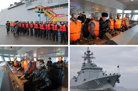 김정은동지께서는 구축함에 오르시여 해병들의 함조종 및 무기체계 계통별복무준비실태를 료해하시였다.