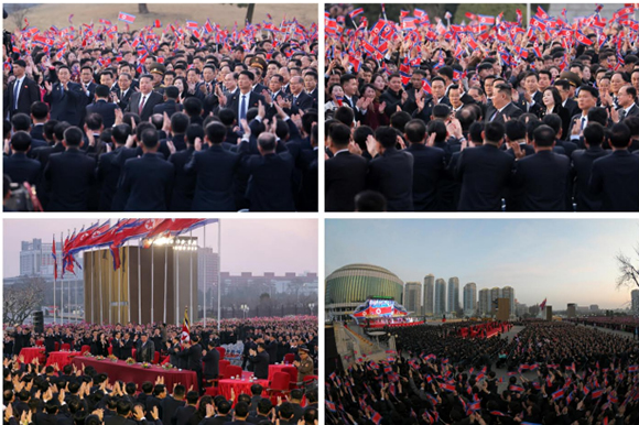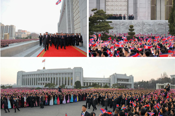 김정은동지께서 최고인민회의 제15기 대의원들과 함께 나오시자 전체 관람자들과 출연자들은 존엄높은 우리 당과 국가, 인민의 최고대표자이시며 모든 승리와 영광의 기치이신 김정은동지께 최대의 경의와 영광을 삼가 드리며 열광의 환호성을 터쳐올리였다.
