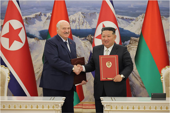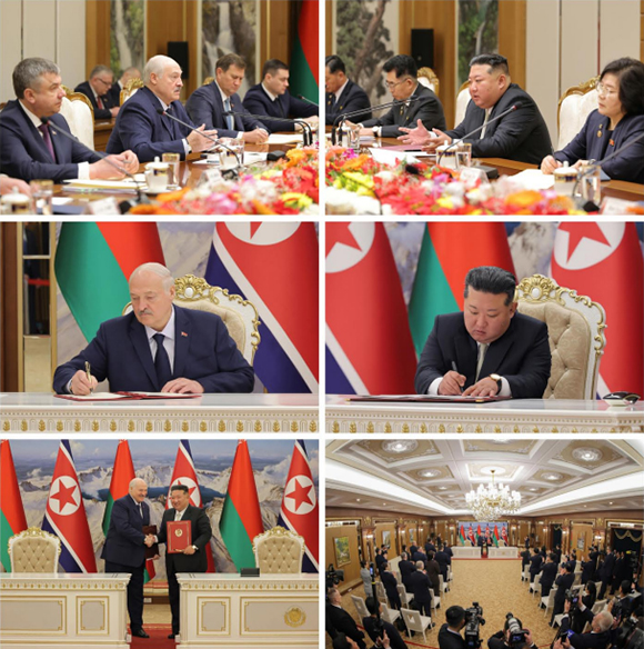 조선민주주의인민공화국 국무위원장 김정은동지께서 벨라루씨공화국 대통령 알렉싼드르 루까쉔꼬동지와 함께 《조선민주주의인민공화국과 벨라루씨공화국사이의 친선 및 협조에 관한 조약》에 서명하시였다.