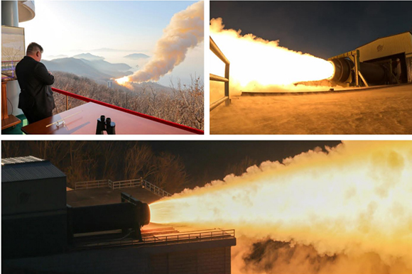 조선로동당 총비서이시며 조선민주주의인민공화국 국무위원장이신 경애하는 김정은동지께서 탄소섬유복합재료를 리용한 대출력고체발동기 지상분출시험을 참관하시였다.
